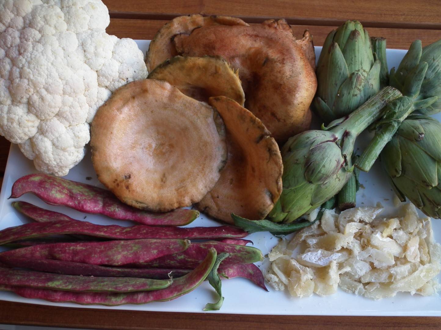 When the oil is hot, add the vegetables and the cod. They will be added one by one every two minutes or so, in order to evenly cook the ingredients. We begin with the cauliflower, two minutes later the artichoke, later the cod, green beans, natural tomato and 12 minutes later saffron milk caps which need less time.