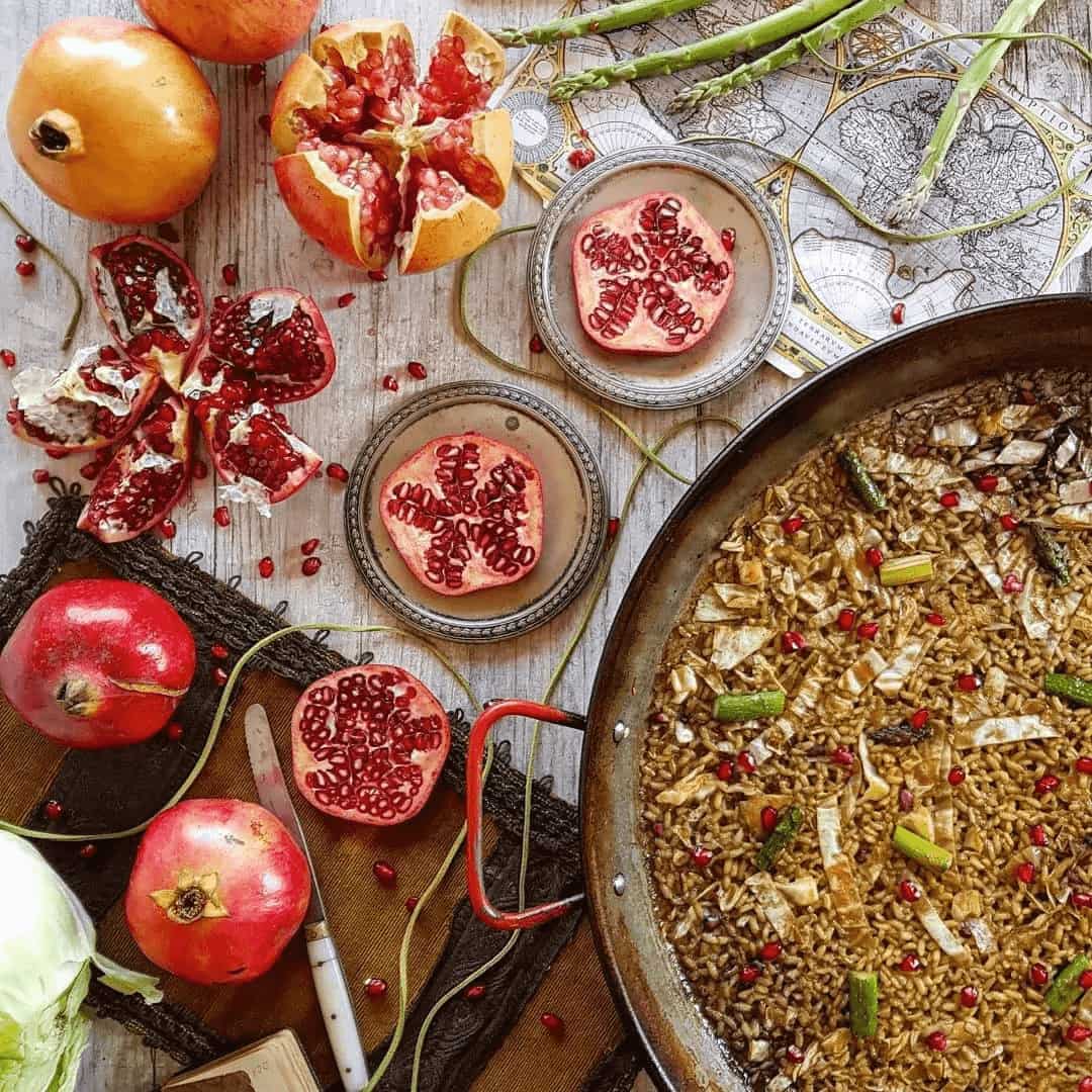 In the last seven minutes, lower the heat to minimum and when the rice is dry, add the pomegranate, which we will have previously gratined.
