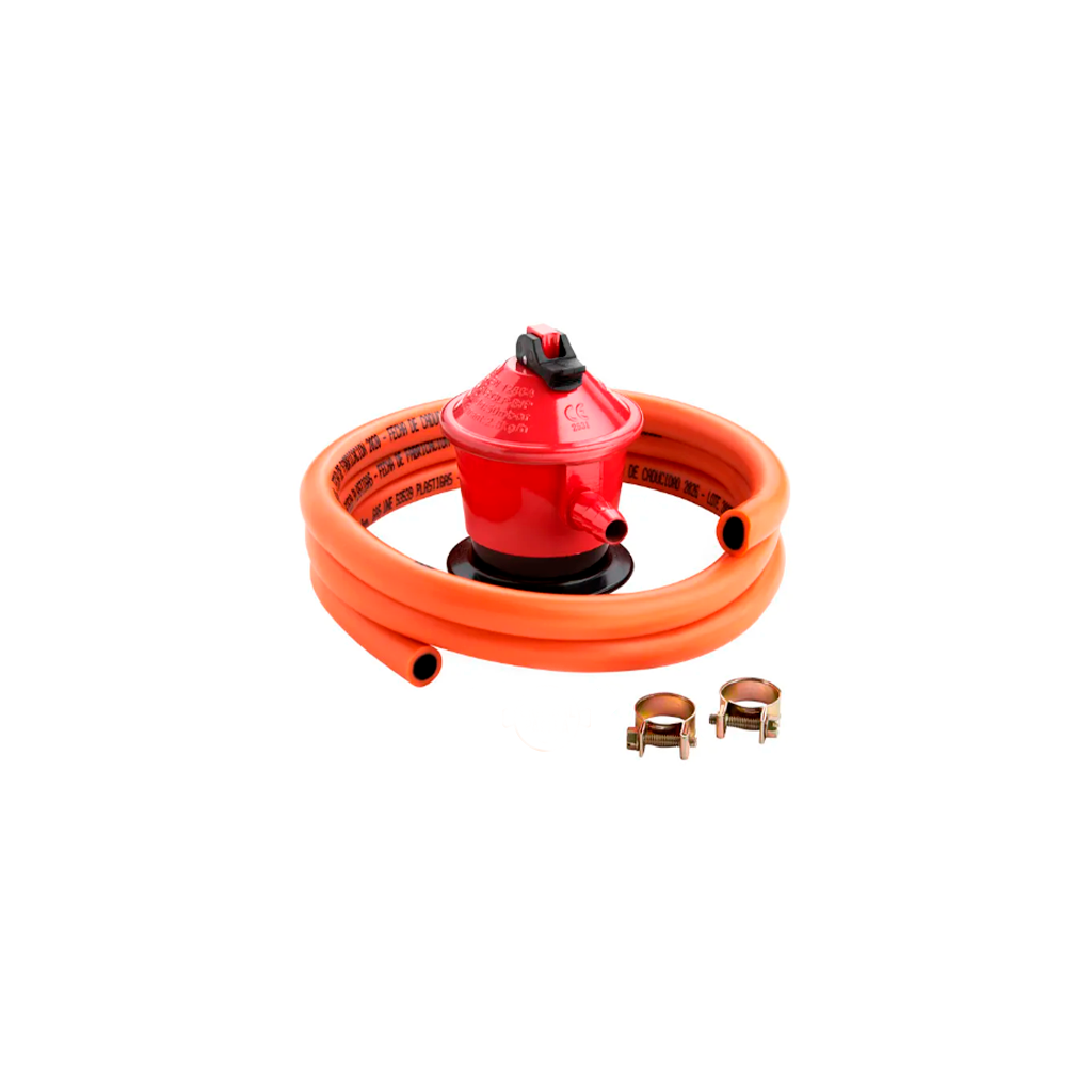 It contains a 50 MBAR propane gas regulator and a flexible gas tube with 2 clamps, perfect for a safe connection of your equipment.