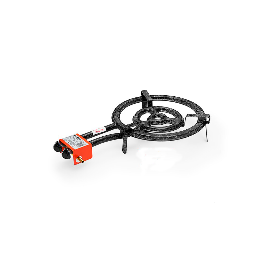 Atmospheric gas burner with integrated support (paellero ring) for outdoor use. The appliance is designed to heat containers or plates containing liquids or food. It comes equipped with x concentric circular burners, joined together by x fixed legs, which support the whole, ensure the stability of the appliance and serve as a support for the cooking containers (paellas, griddles, frying pans, roasters, etc.).