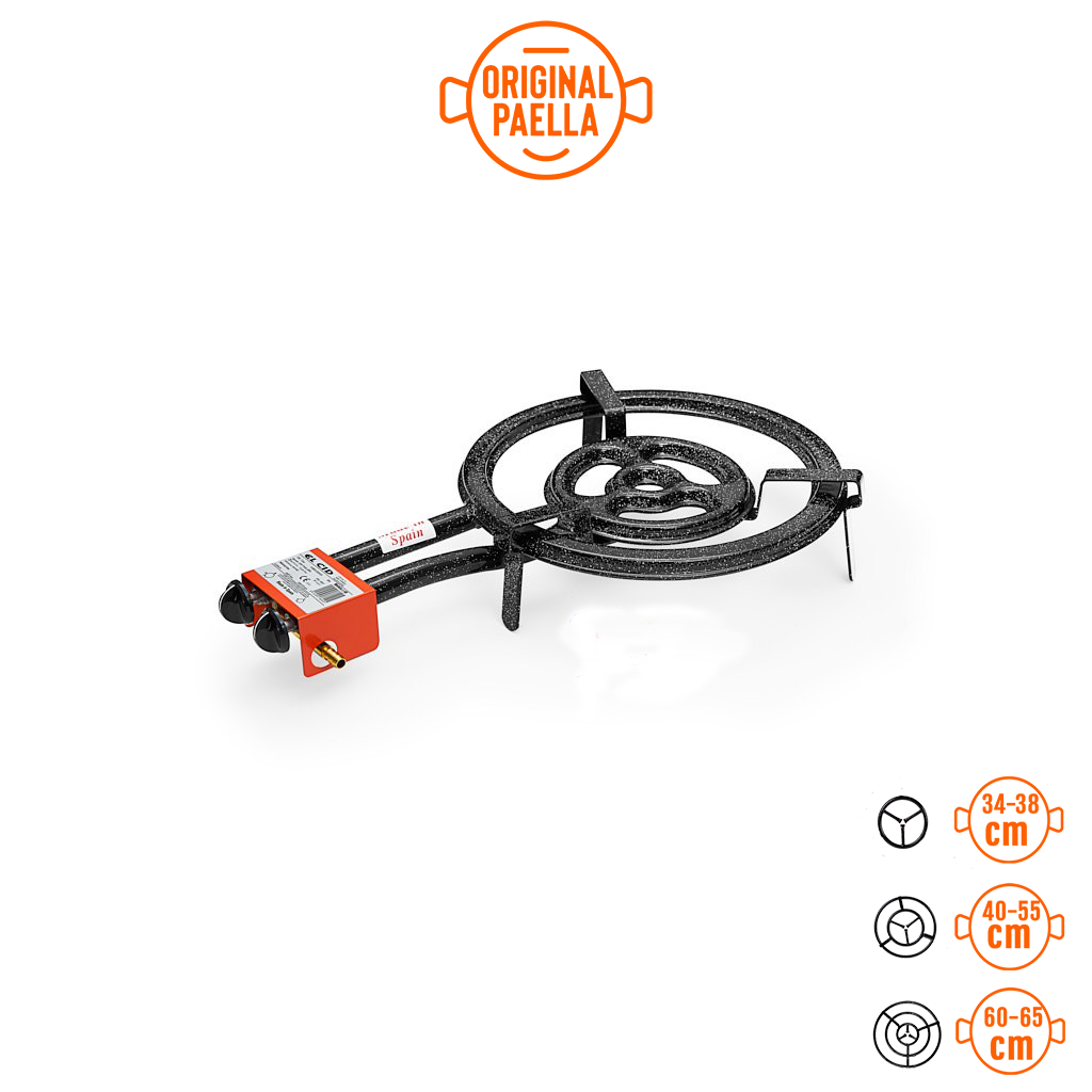 - The 40 cm high power paella burner thanks to its 2 burners for independent use is very versatile, with the inner ring you can cook paellas from 34 cm to 40 cm and with the both rings you can cook paellas from 50 to 65 cm, from 2 to 25 people.