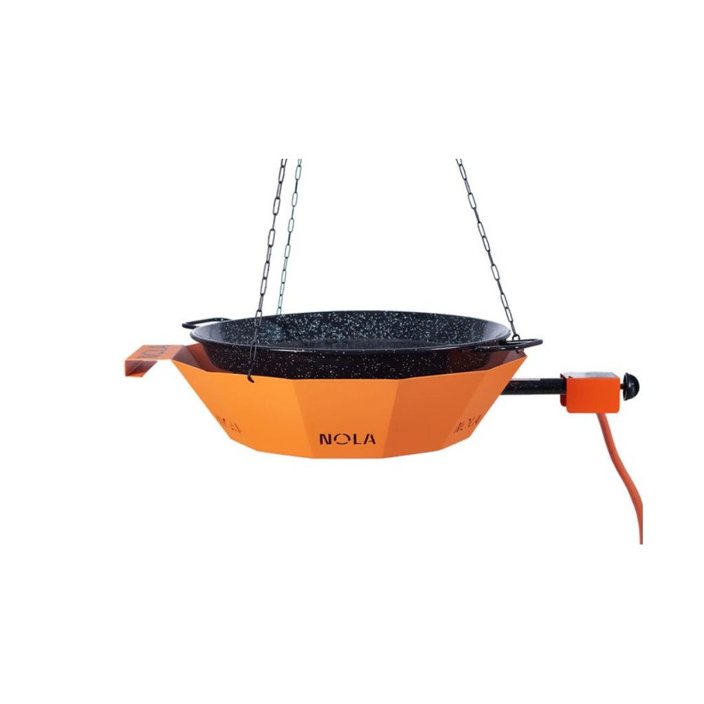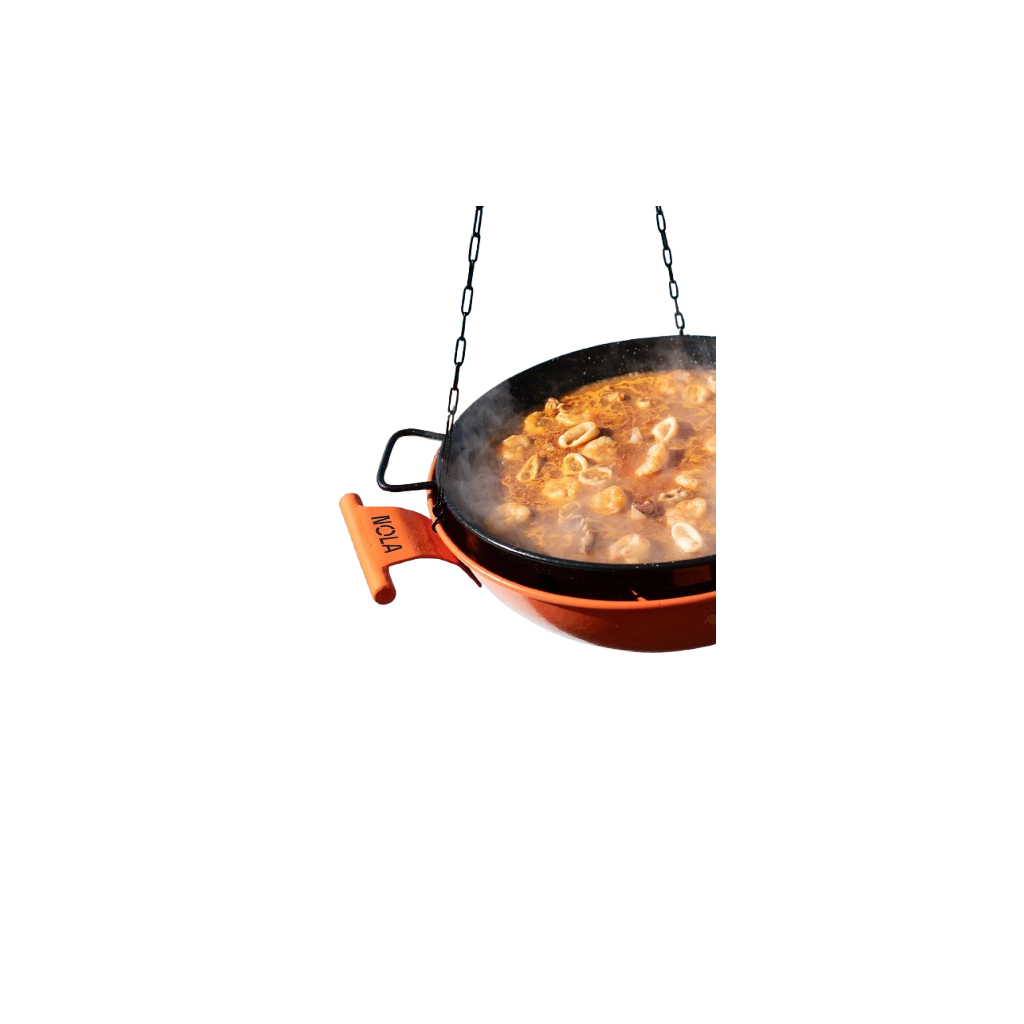 The Nola paella cooker comes with its own built-in burner, designed to be hung, making it function as a suspension kitchen, allowing us to cook paellas, meats, vegetables, or fish on the deck of our boat without worrying about the rocking caused by waves or the boat’s movement from the sway of the sea when left floating. Nola works like a pendulum, which absorbs and compensates for this motion, providing us a stable point to cook as we wish.